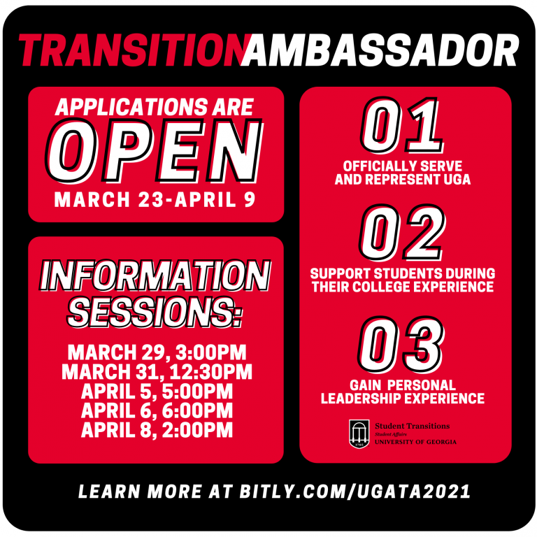 If you are passionate about the student experience and looking for a way to gain leadership skills, support and give back to UGA students, and represent the University of Georgia, consider applying to be a member of the inaugural class of the Transition Ambassadors!